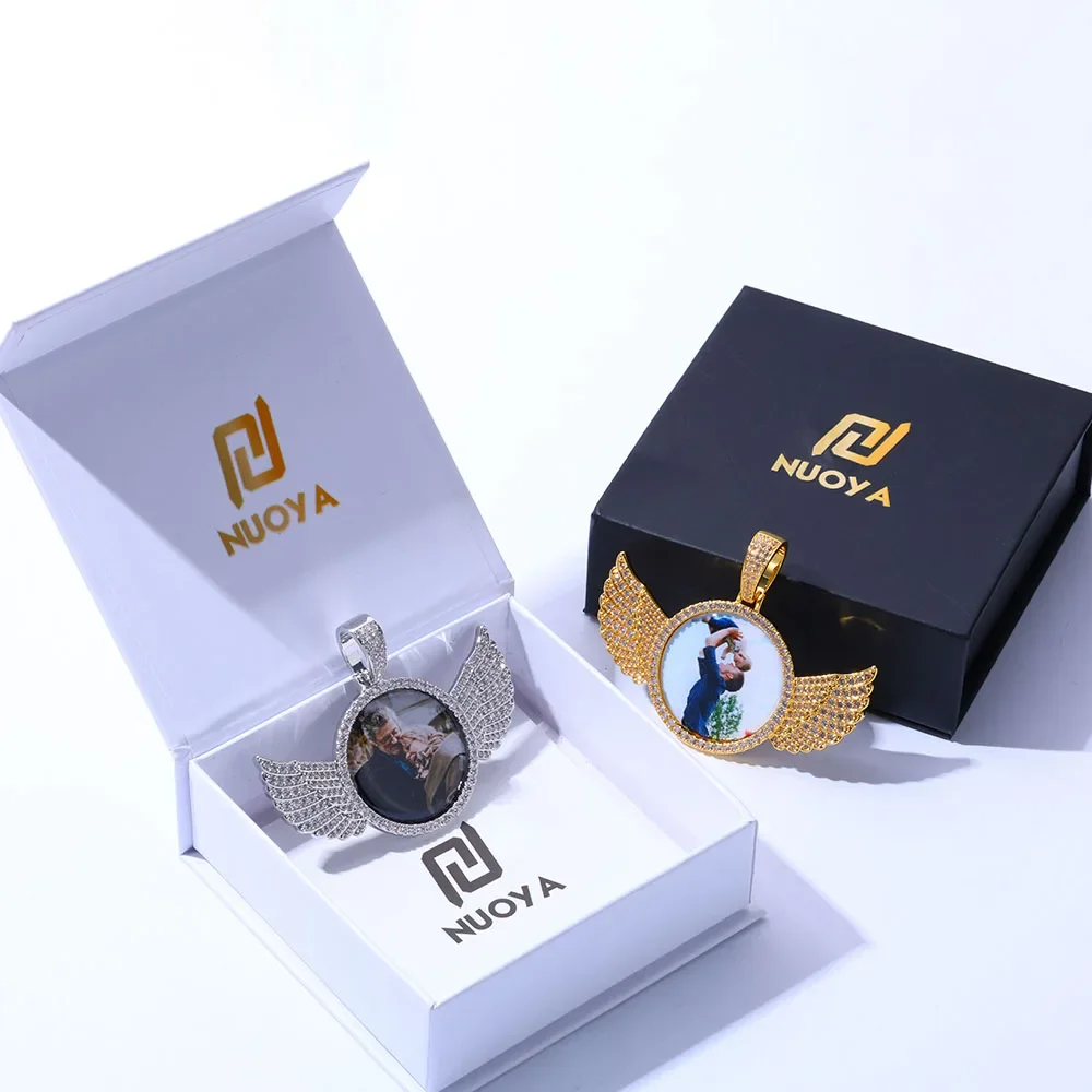 • Custom Photo Pendant Personalized Iced Out Angel Wings Circle Memory Picture Chain Pendant Medallion Necklace Birthday Gift