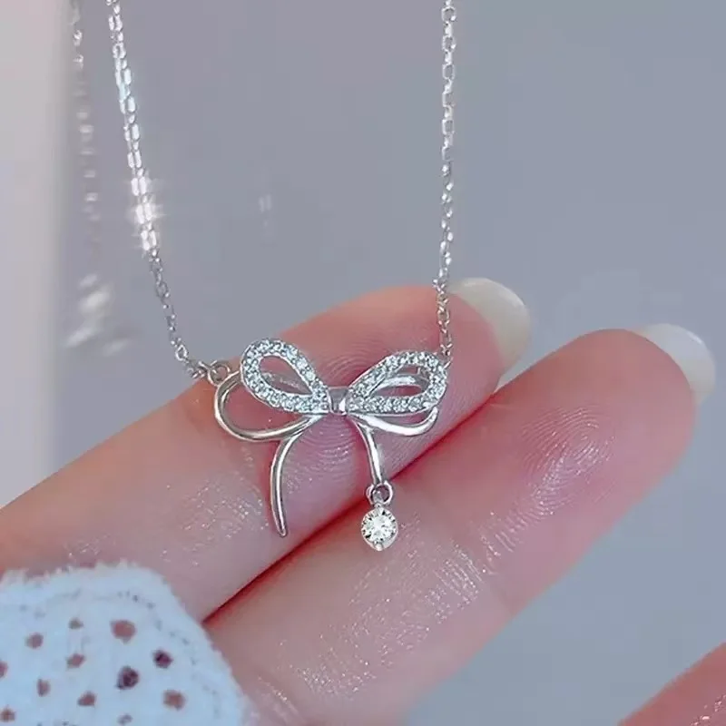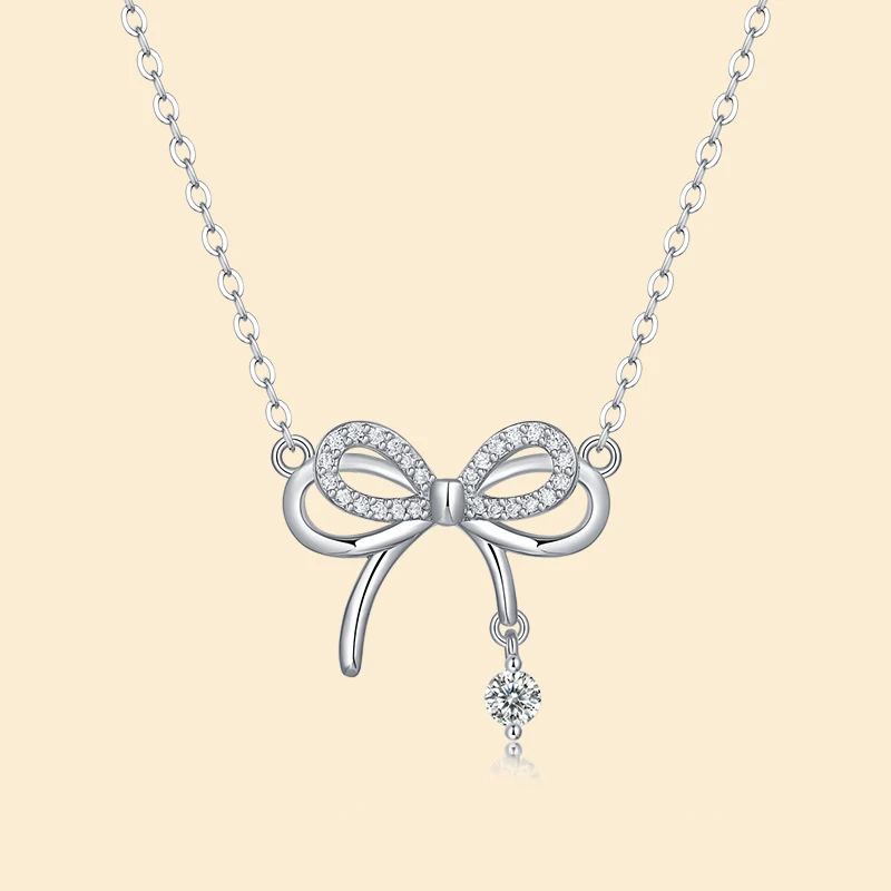 ONE CARATS 925 Sterling Silver Moissanite Bow Necklace for Women Elegant Ribbon Pendant with Dainty CZ Diamond Gift Jewelry