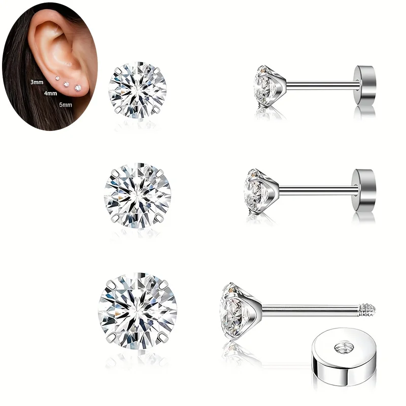 EVISPOL Hypoallergenic Stainless Steel Earring Set for Men Women Cubic Zirconia Flat Back CartilageTragus Helix Piercing Jewelry